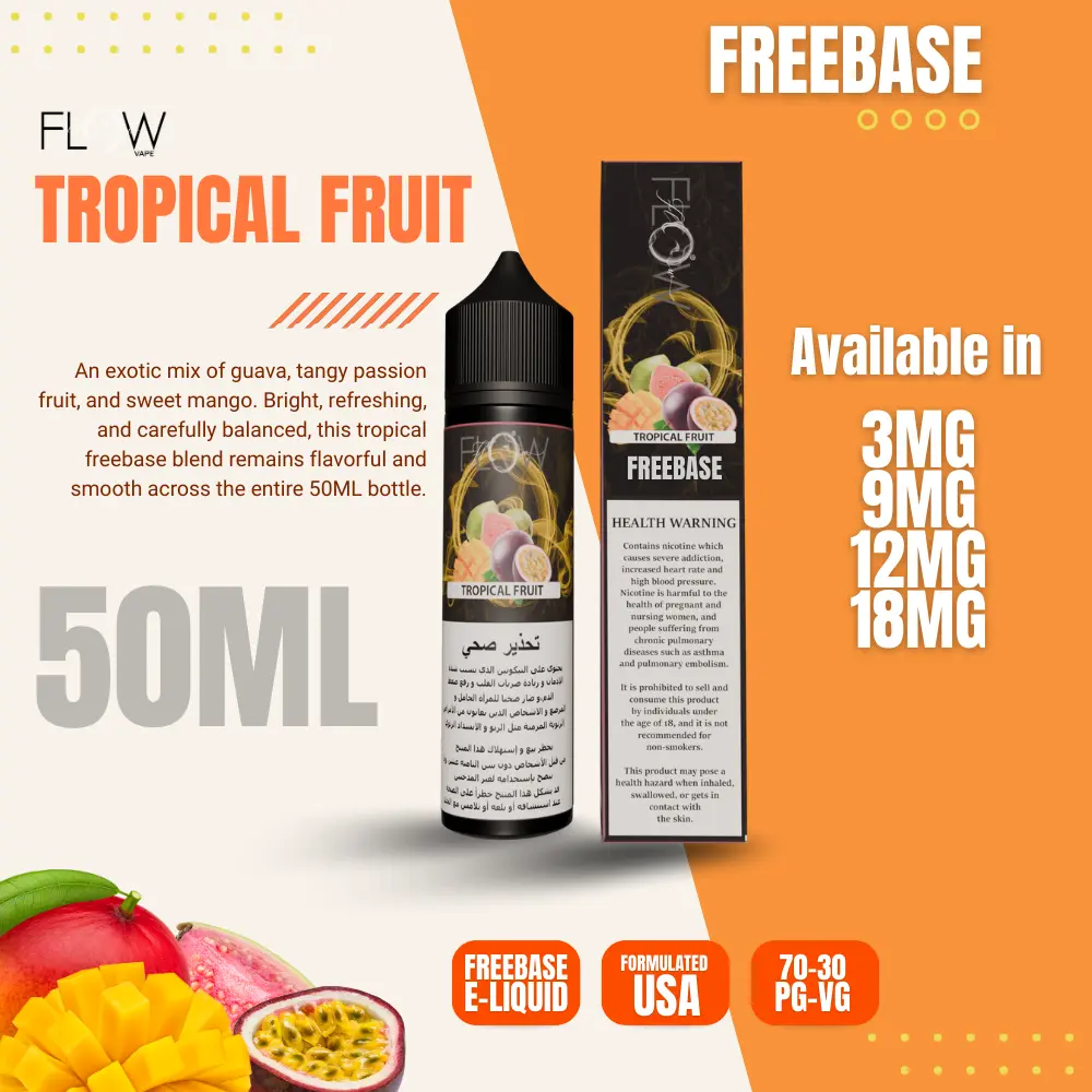 An exotic mix of guava, tangy passion fruit, and sweet mango. Bright, refreshing, and carefully balanced, this tropical freebase blend remains flavorful and smooth across the entire 50ML bottle.
