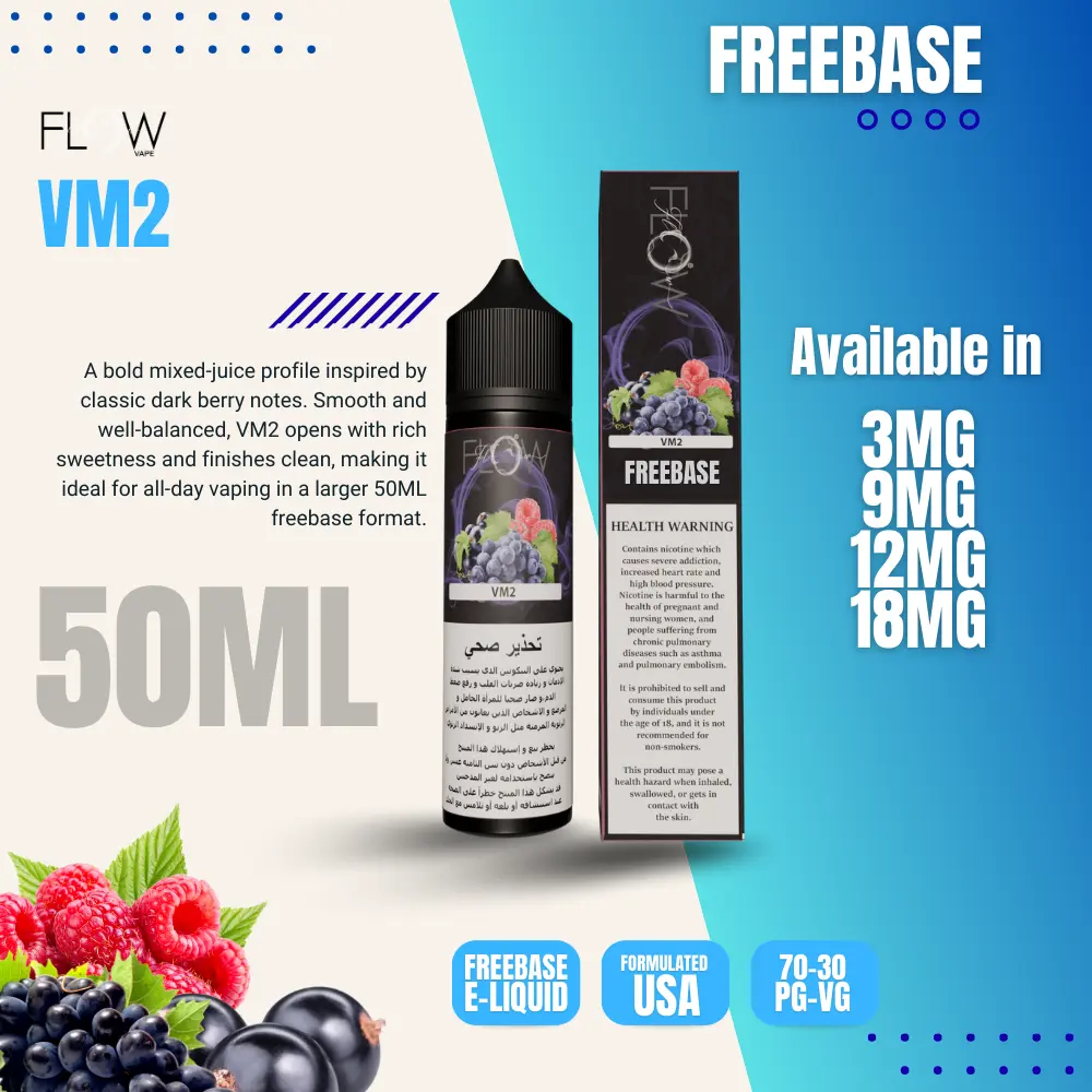 A bold mixed-juice profile inspired by classic dark berry notes. Smooth and well-balanced, VM2 opens with rich sweetness and finishes clean, making it ideal for all-day vaping in a larger 50ML freebase format.